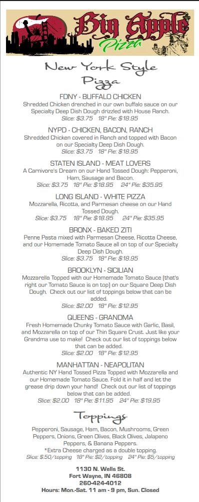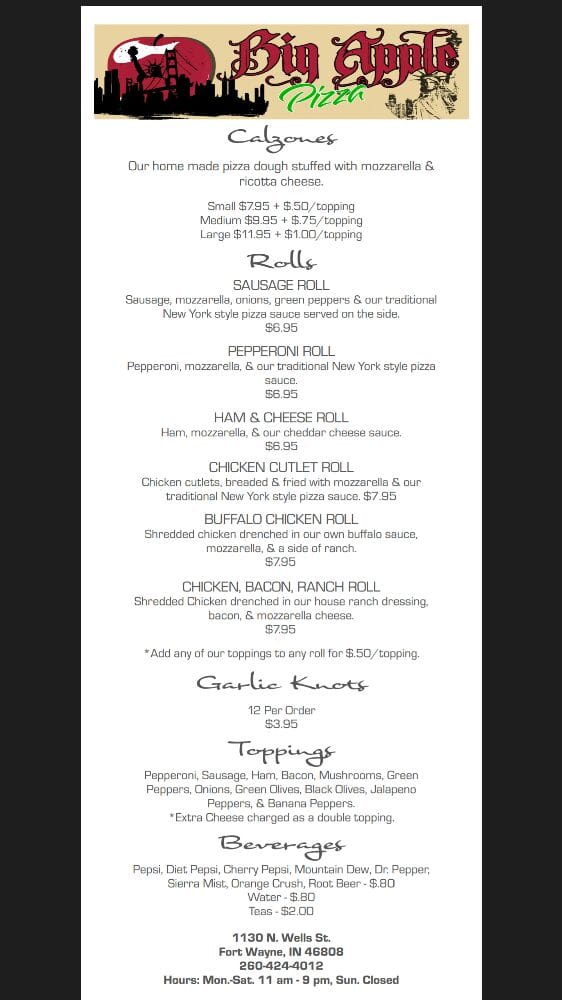 Big Apple Pizza, located in Fort Wayne, IN, offers a wide range of delicious options for pizza lovers. With the convenience of delivery, takeout, and reservations, along with many vegetarian choices, this establishment caters to various preferences. The menu includes delectable appetizers like Garlic Knots, satisfying salads such as the House Salad, and delightful rolls like the Apple Dessert Roll. The restaurant provides a pleasant setting with outdoor seating, making it ideal for a casual dining experience. With the option for catering and a variety of amenities such as Wi-Fi, alcohol, and TV, Big Apple Pizza ensures an enjoyable visit for all customers. Don't miss out on this gem for a satisfying lunch or dinner!